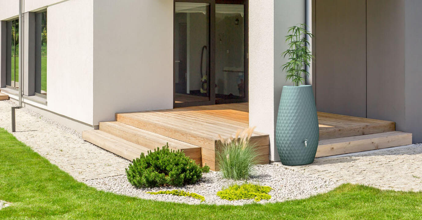 Ein Regenwasserbehälter ist Witterungseinflüssen und Sonneneinstrahlung ausgesetzt. Auf diese Bedingungen abgestimmte Materialien sorgen für eine lang anhaltend gute Optik.