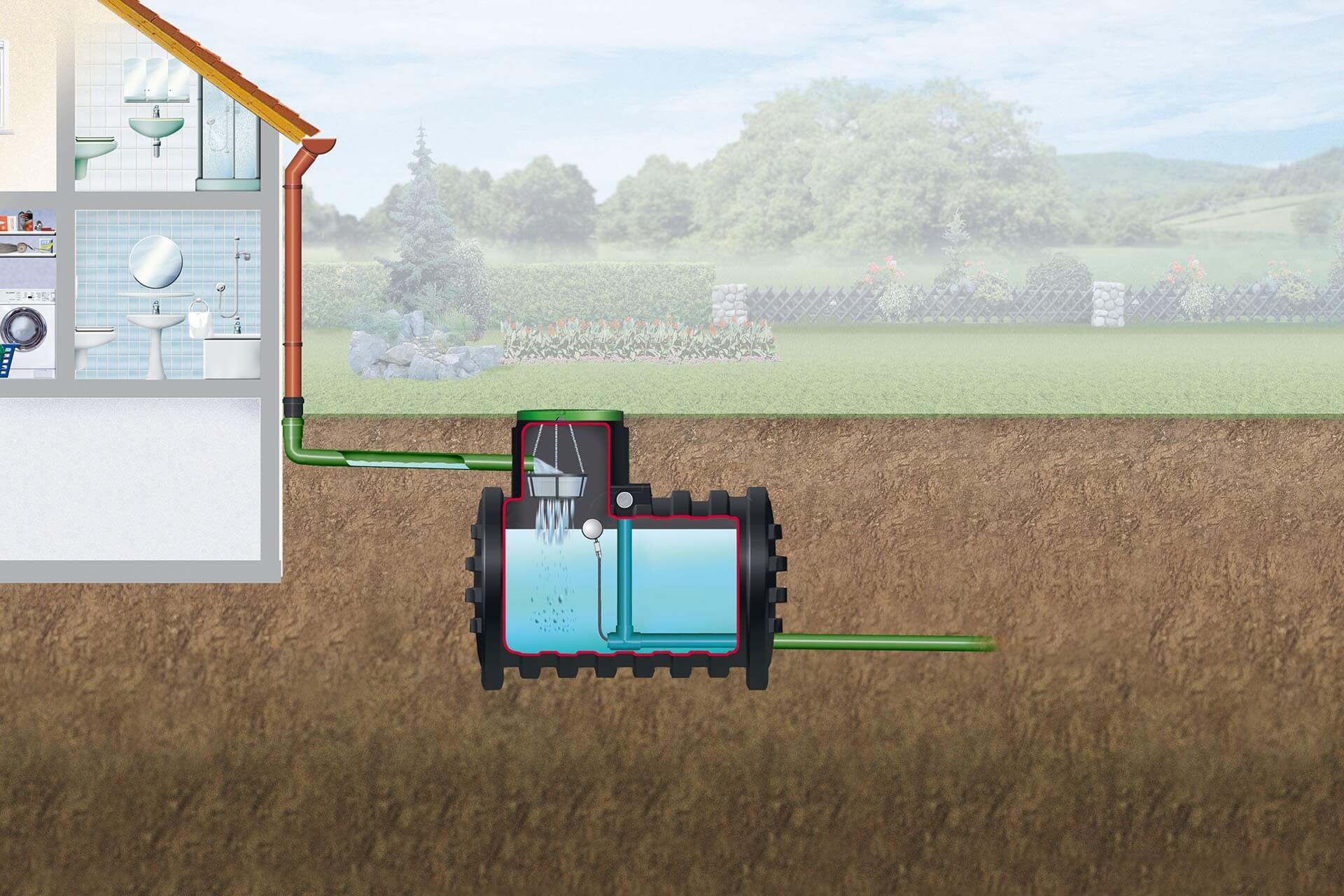 Eine 4rain Retentionszisterne hält Niederschläge zurück und gibt diese zeitverzögert an die Kanalisation ab. Der Kanal wird damit bei Niederschlägen entlastet. Eine sog. Ablaufdrossel regelt den Abfluss des Wassers an den Kanal mit 0,05 bis 2 l/s. Bei starkem Regen steigt der Wasserstand in der Zisterne kurzfristig an und sinkt nach dem Regen wieder ab. 4rain Retentionszisternen verfügen zudem über einen Notüberlauf, der ein Überlaufen des Speichers verhindert.
