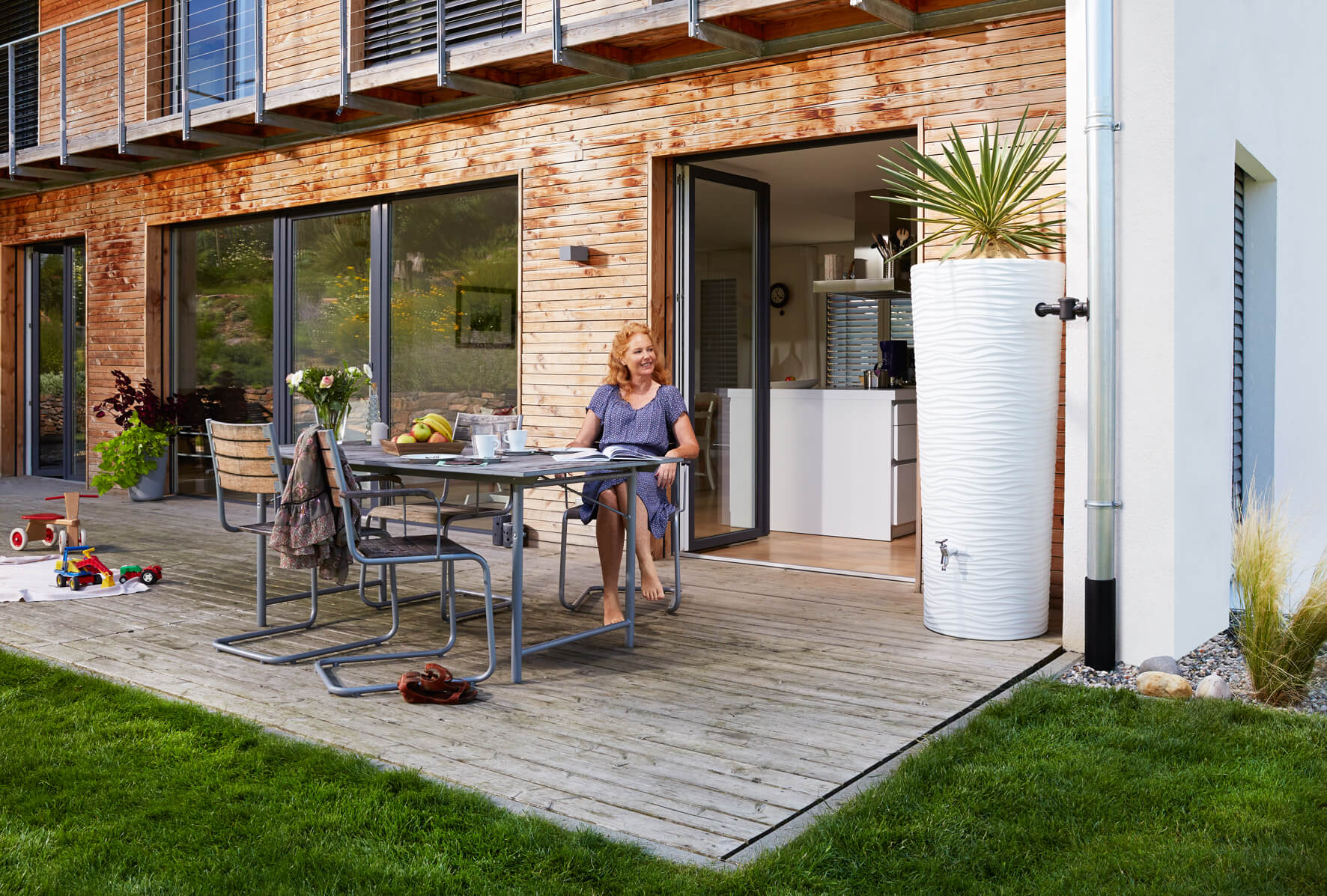 La bandeja para plantas integrada, de cómoda extracción y con altura de 20 cm, permite un diseño individual para todos los depósitos de agua de lluvia 2en1.
