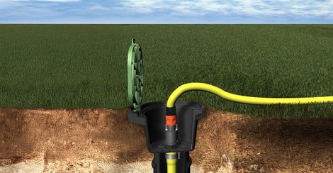 Para facilitar la conexión al riego, la arqueta de conexiones Gardena le da la solución ideal. Queda perfectamente integrado al jardín. Tiene 2 salidas y una conexión inferior de 1"