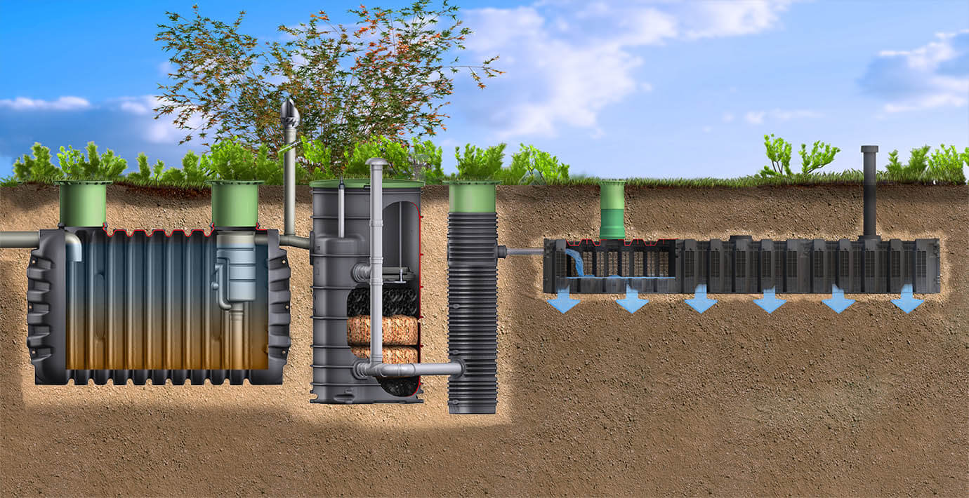 - Model wyposażony jest w przepompownię, która umożliwia odprowadzanie oczyszczonego ścieku do elementów rozsączających. Rozwiązanie to dobrze sprawdzi się zarówno na działkach z odpowiednią przestrzenią dla tuneli rozsączających jak i z ograniczoną powierzchnią - dla studni chłonnych.